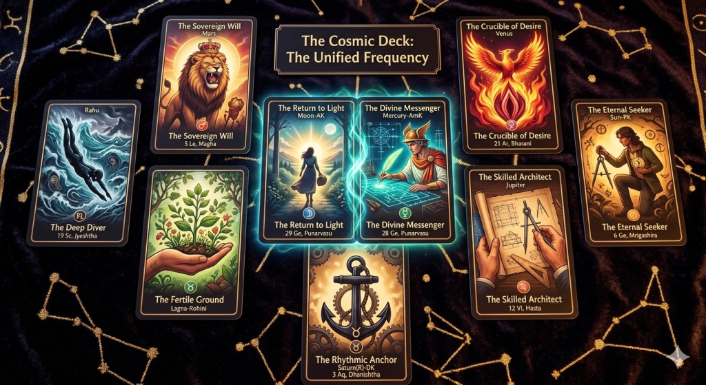 This deck transforms your exact birth details into 55 personalized cosmic cards, each revealing a unique layer of your life, personality, and destiny patterns.