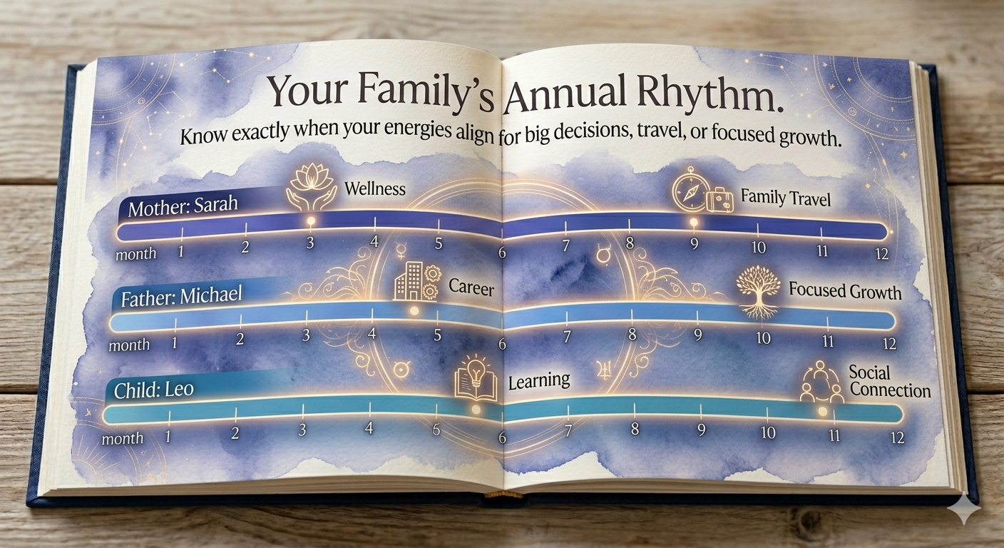 Unveiling Your Shared Destiny A family isn’t just a group of individuals; it’s a single cosmic ecosystem. For the first time, see how the paths of Mother, Father, and Child interweave to create a unique legacy.