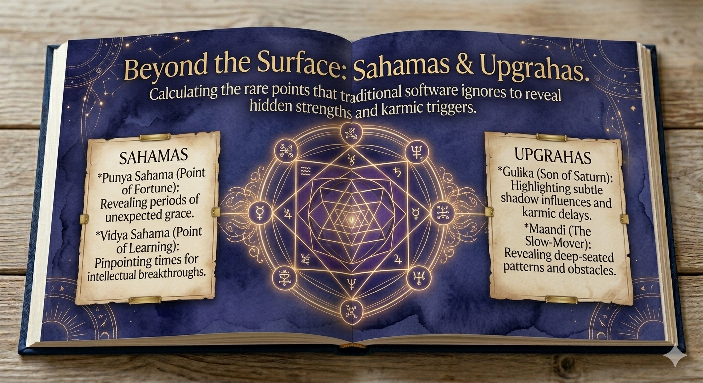 • Upgrahas: गुलिका और मांडी जैसे अदृश्य ग्रहों का गहरा विश्लेषण।
